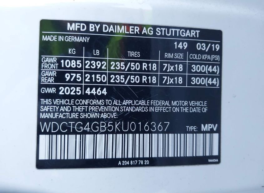 - VIN: WDCTG4GB5KU016367