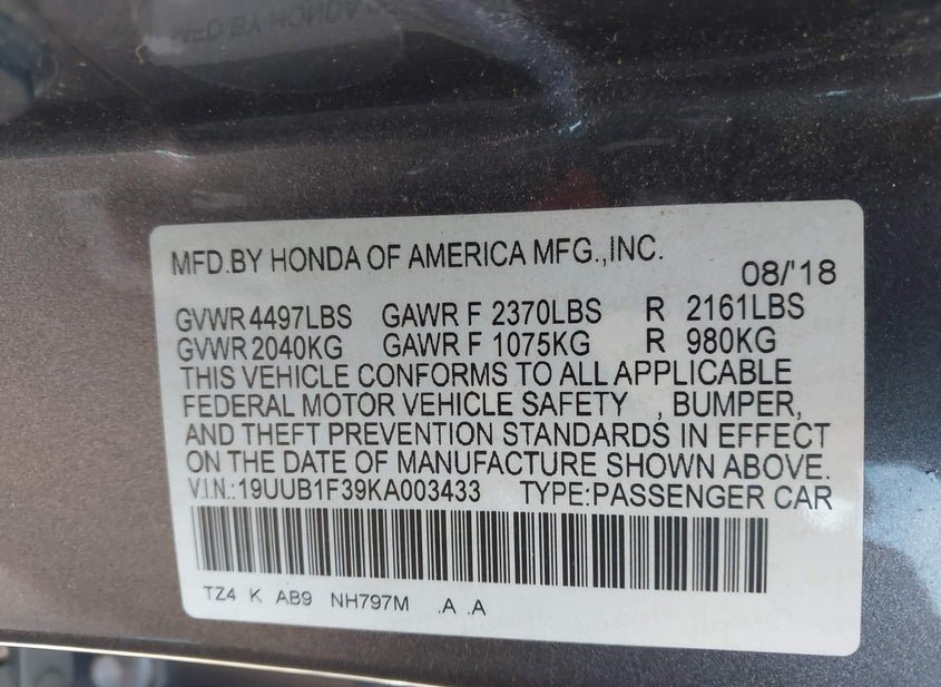 - VIN: 19UUB1F39KA003433