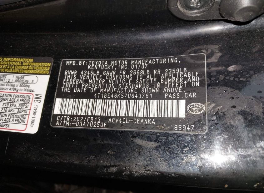 - Название лота: 2007 TOYOTA CAMRY LE