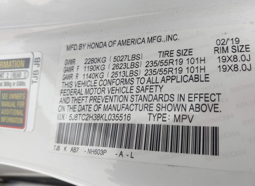 - VIN: 5J8TC2H38KL035516
