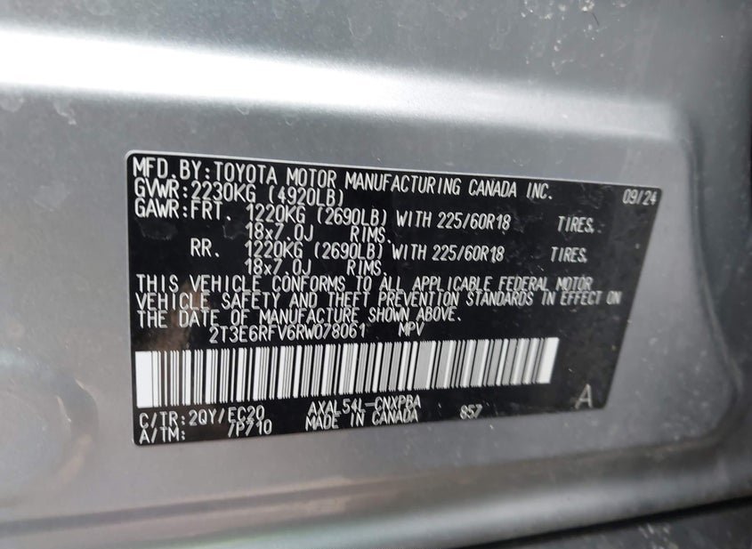 - VIN: 2T3E6RFV6RW078061