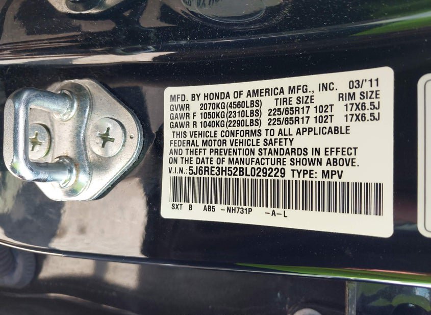 - VIN: 5J6RE3H52BL029229