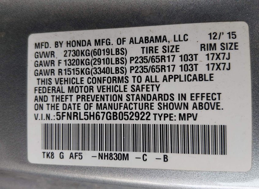 - VIN: 5FNRL5H67GB052922