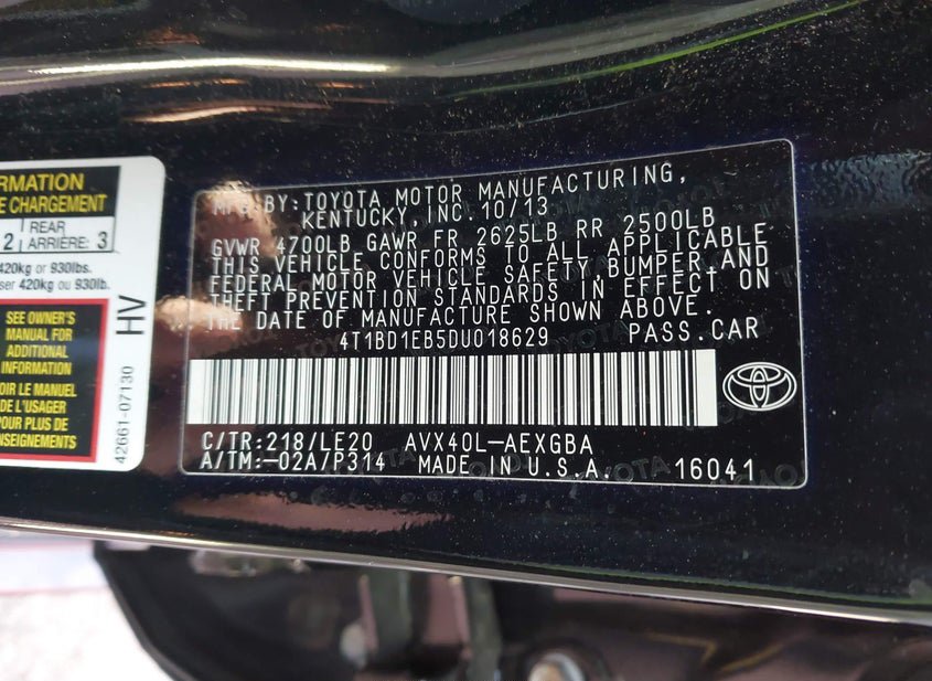 - VIN: 4T1BD1EB5DU018629