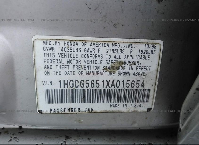 - VIN: 1HGCG5651XA015654