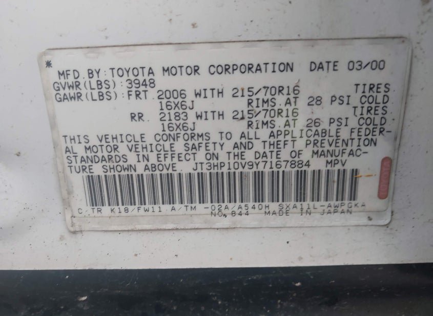 - VIN: JT3HP10V9Y7167884