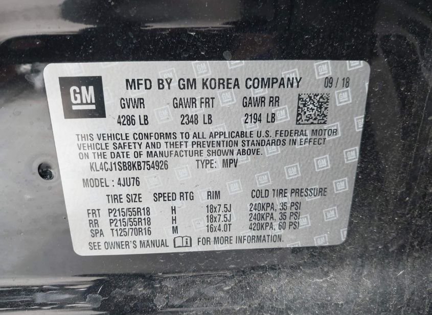 - VIN: KL4CJ1SB8KB754926