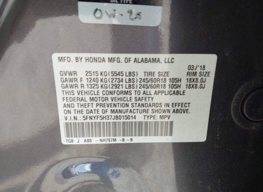 - VIN: 5FNYF5H37JB015014
