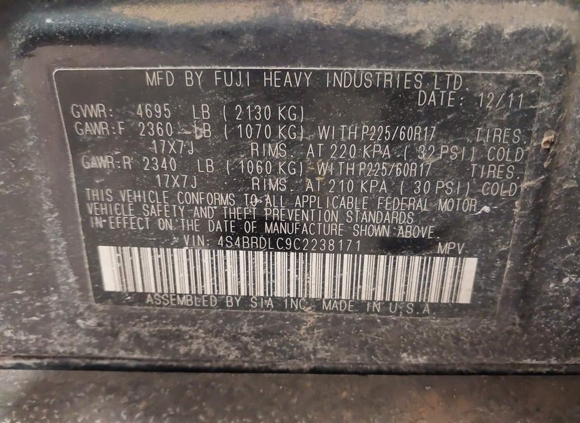- Название лота: 2012 SUBARU OUTBACK 3.6R LIMITED