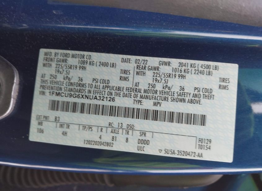- VIN: 1FMCU9G6XNUA32126