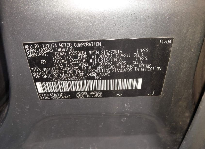 - VIN: JTEGD20V450058447