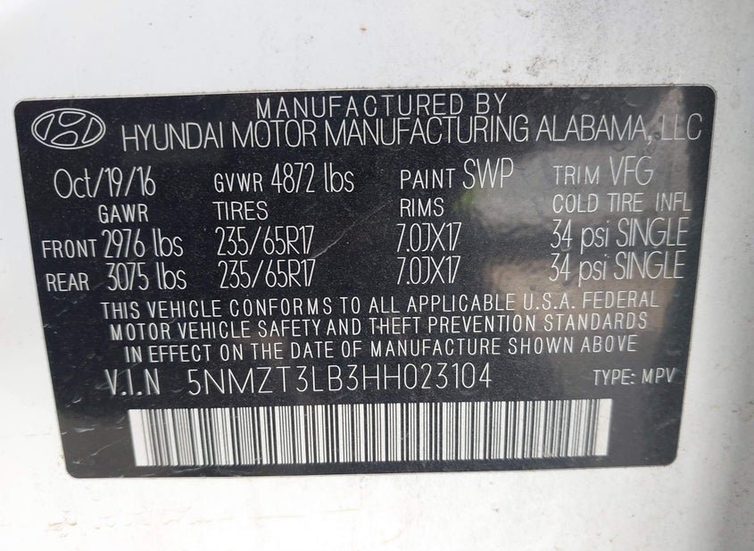 - VIN: 5NMZT3LB3HH023104