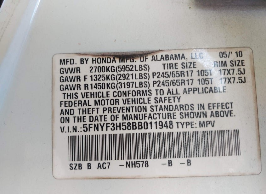 - VIN: 5FNYF3H58BB011948