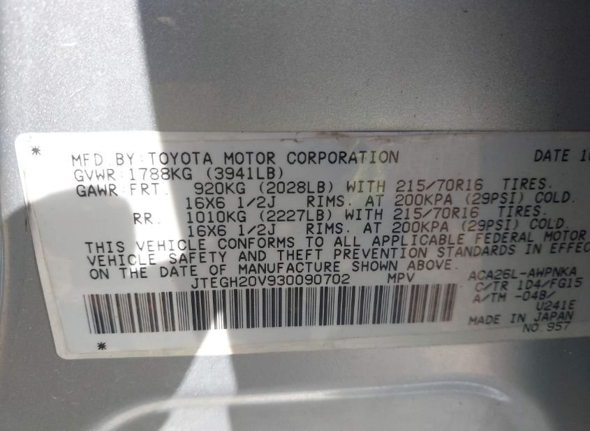 - VIN: JTEGH20V930090702