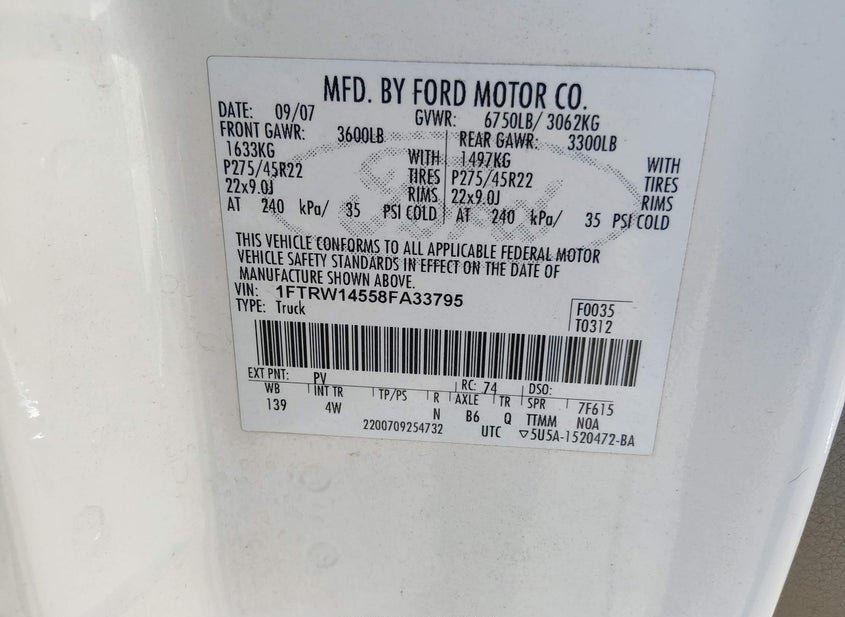 - VIN: 1FTRW14558FA33795