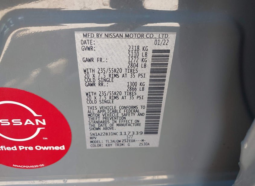 - VIN: 5N1AZ2BJ1NC117339