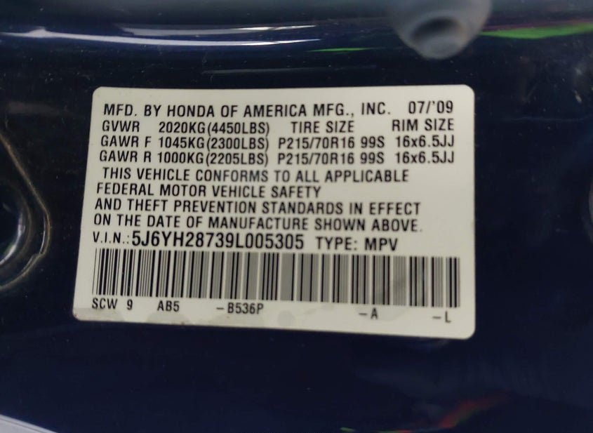 - VIN: 5J6YH28739L005305