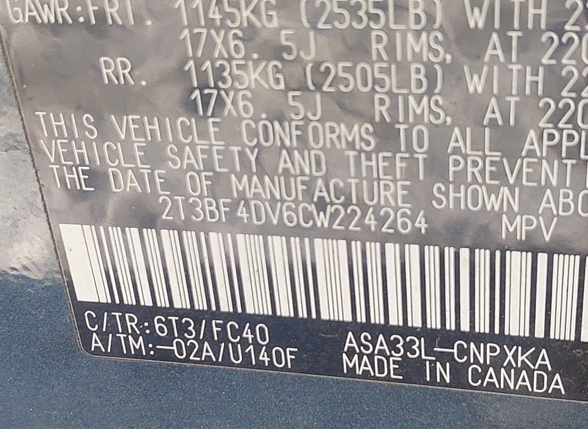 - VIN: 2T3BF4DV6CW224264