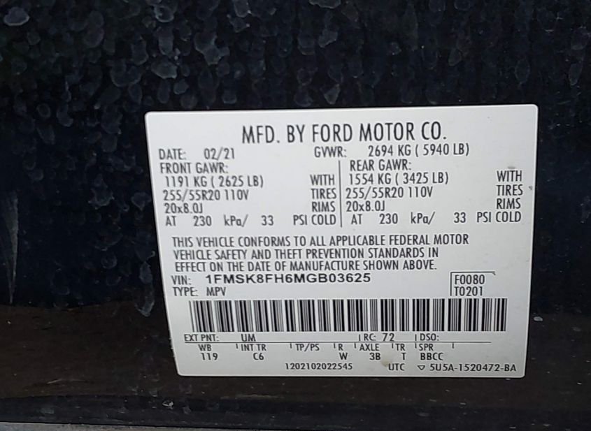 - VIN: 1FMSK8FH6MGB03625