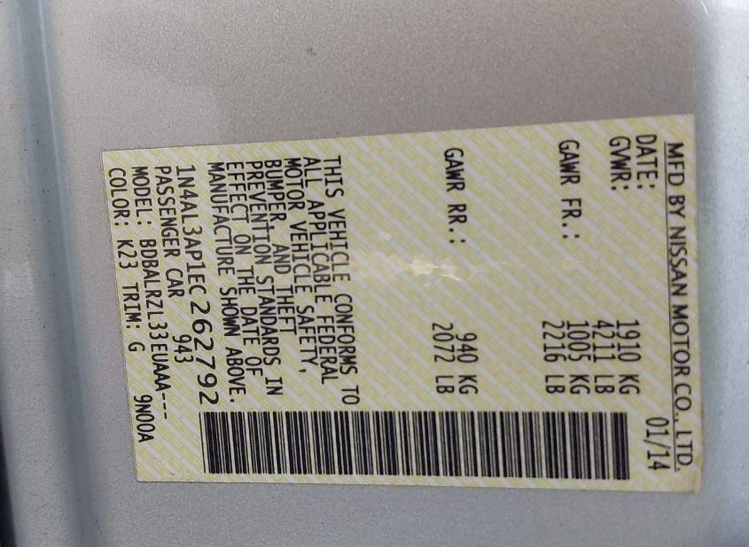 - VIN: 1N4AL3AP1EC262792