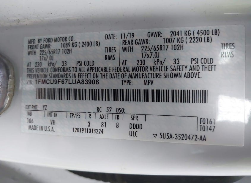 - VIN: 1FMCU9F67LUA83906