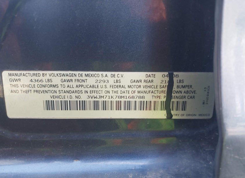- VIN: 3VWJM71K78M168788