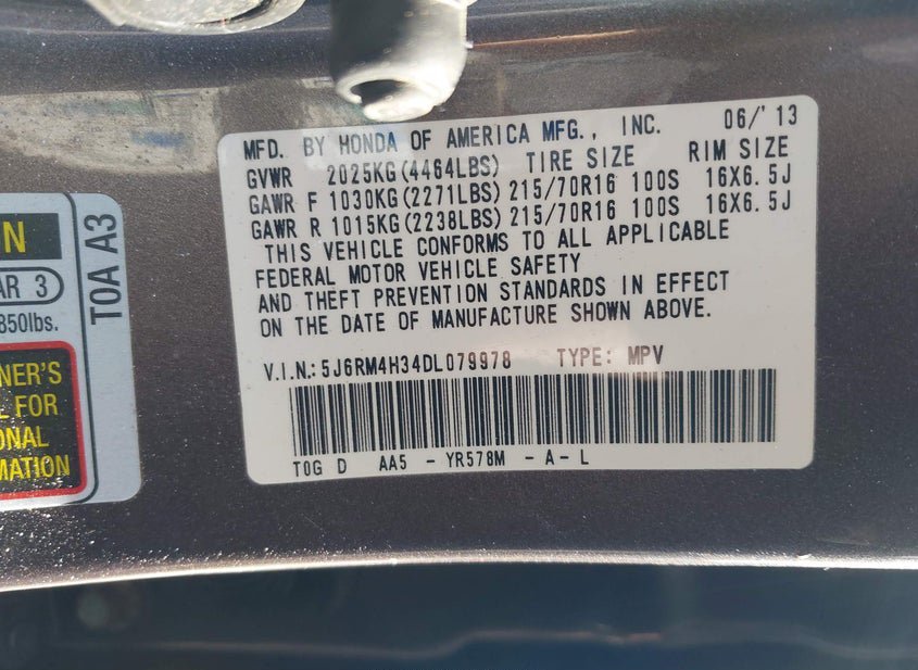 - VIN: 5J6RM4H34DL079978