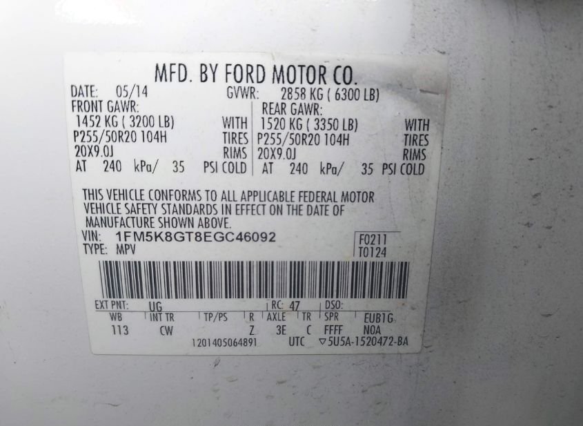 - VIN: 1FM5K8GT8EGC46092