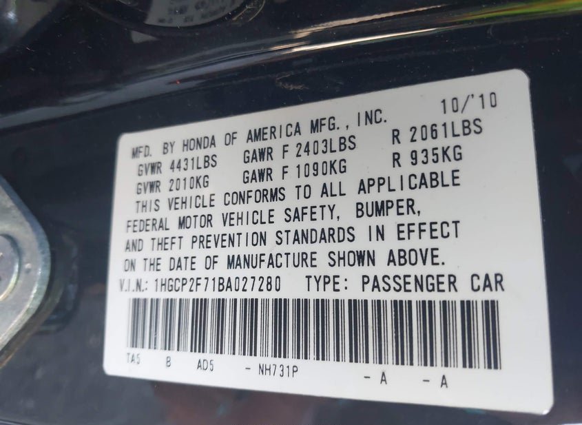 - VIN: 1HGCP2F71BA027280
