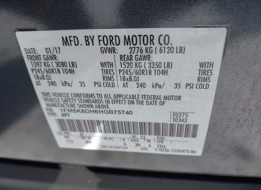 - VIN: 1FM5K8DH6HGB75740