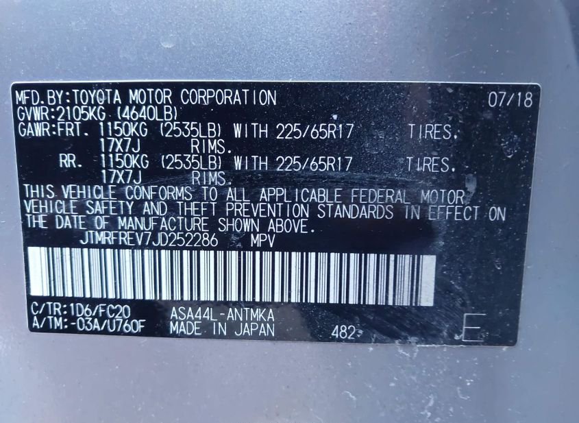 - VIN: JTMRFREV7JD252286