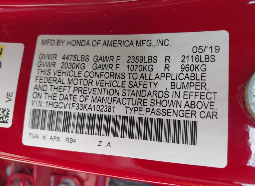 - VIN: 1HGCV1F33KA102381