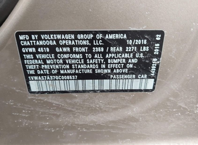 - Название лота: 2016 VOLKSWAGEN PASSAT 1.8T S