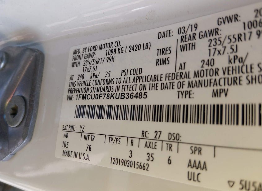 - VIN: 1FMCU0F78KUB36485