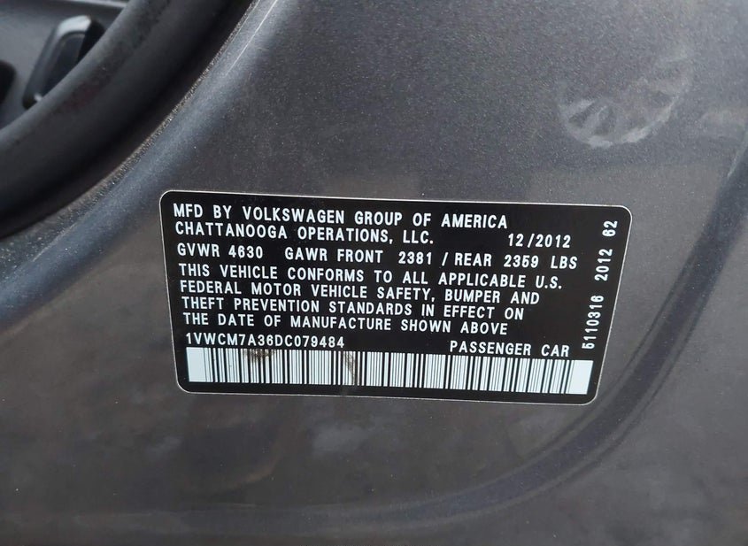 - Название лота: 2013 VOLKSWAGEN PASSAT 3.6L V6 SEL PREMIUM