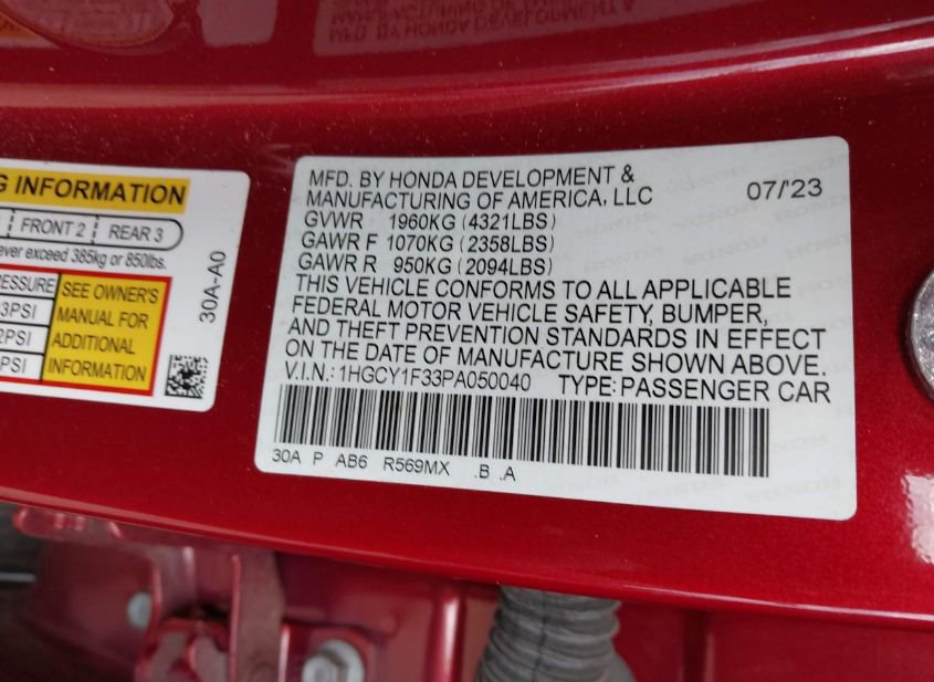 - VIN: 1HGCY1F33PA050040
