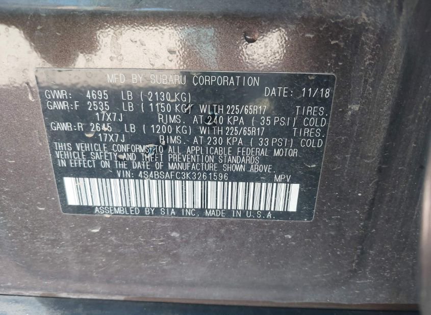 - VIN: 4S4BSAFC3K3261596