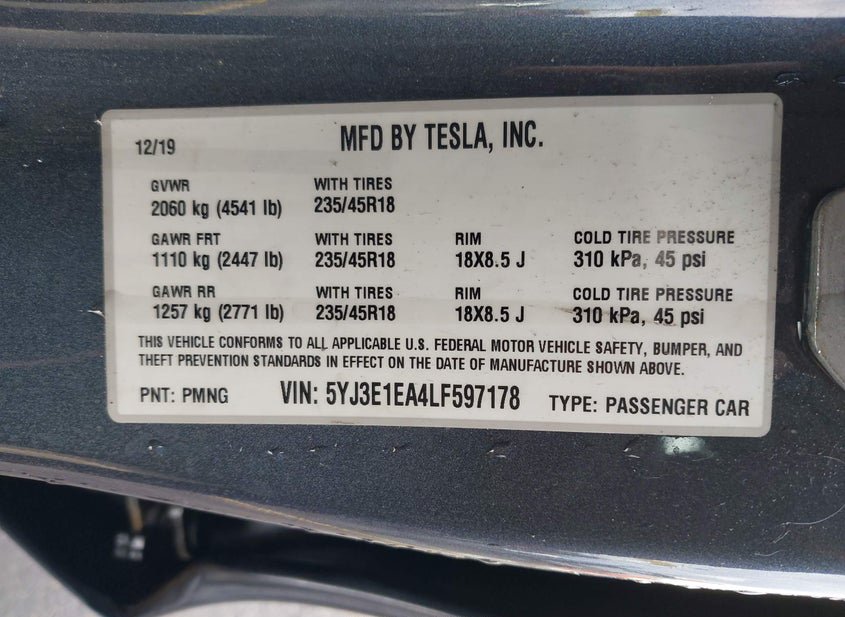 - VIN: 5YJ3E1EA4LF597178