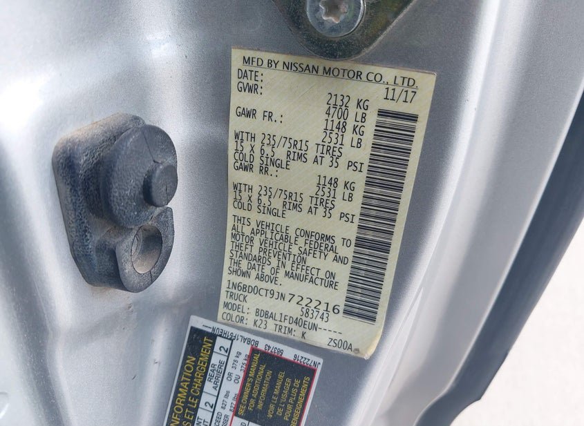 - VIN: 1N6BD0CT9JN722216