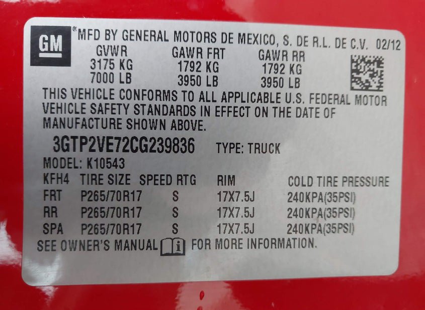 - VIN: 3GTP2VE72CG239836