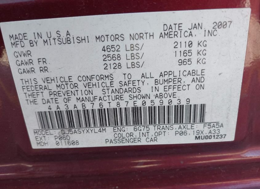 - VIN: 4A3AB76T87E059039