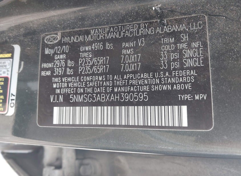 - VIN: 5NMSG3ABXAH390595