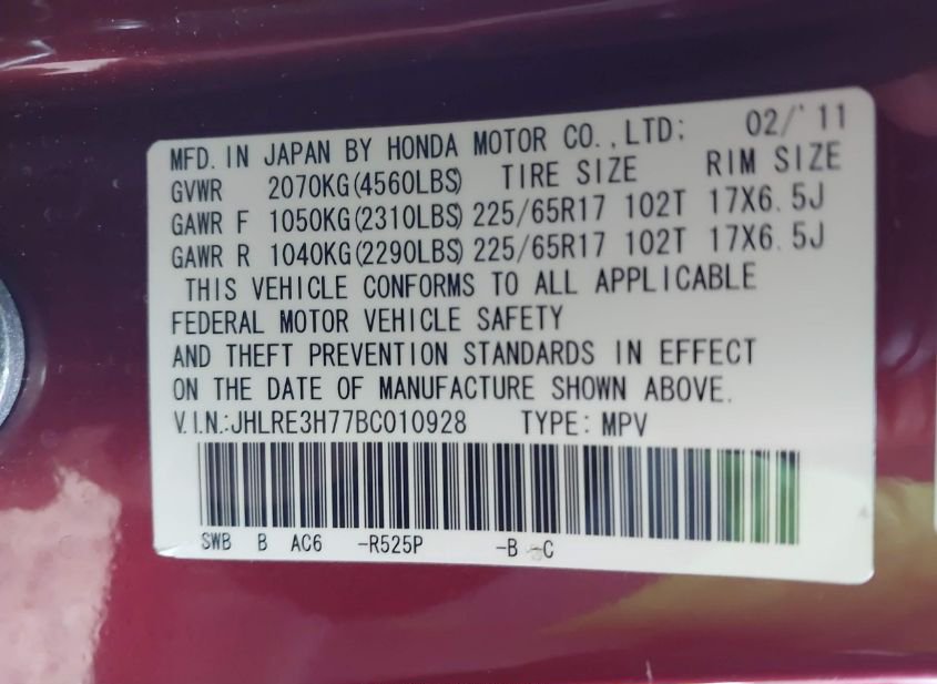 - VIN: JHLRE3H77BC010928