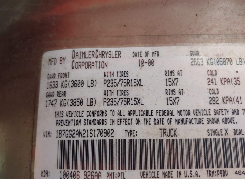 - VIN: 1B7GG2AN21S170902