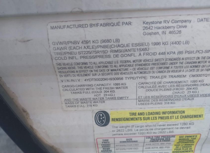 - VIN: 4YDT30020KH930956