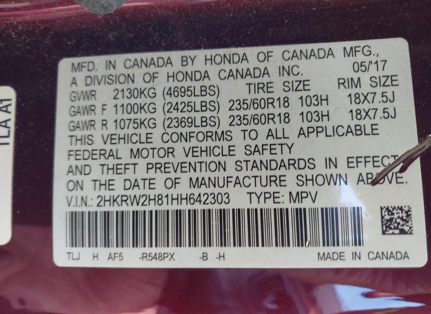 - VIN: 2HKRW2H81HH642303
