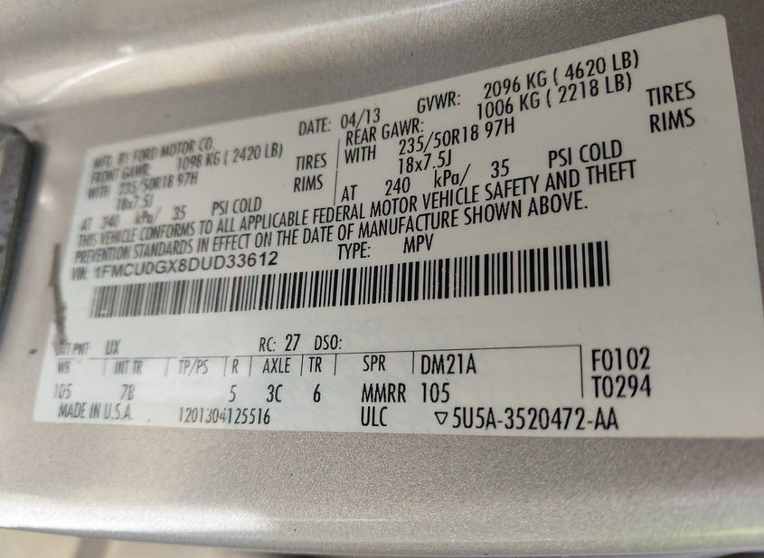 - VIN: 1FMCU0GX8DUD33612