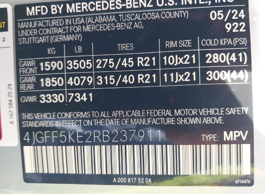 - VIN: 4JGFF5KE2RB237911