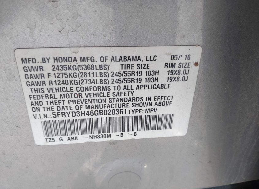- VIN: 5FRYD3H46GB020361
