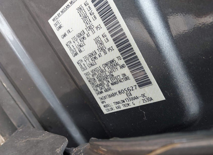 - VIN: 5N1BT3BA8PC805627